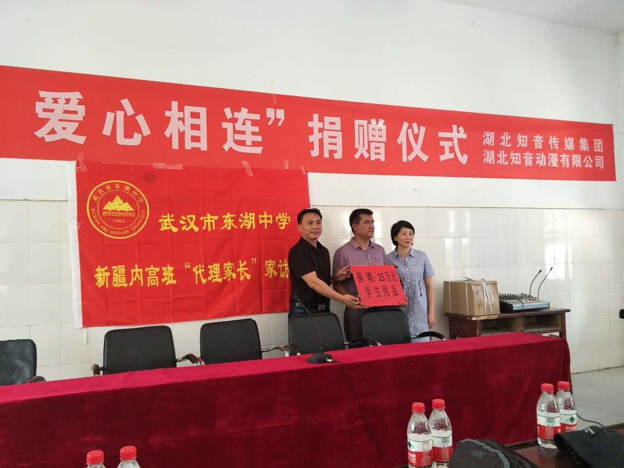 集团董事长刘学明、总经理宋以超一直以来,对东湖中学新疆班代理家长活动都十分重视。得知今年学校准备组织代理家长远赴新疆进行家访,两位领导一致表示:知音集团一定要将大爱带给更多的新疆孩子!他们委托今年参加家访活动的王应鲲代表集团党委和知音动漫党支部将价值25万元的学习用品带到新疆,亲手捐赠给那里渴望学习的贫困孩子。