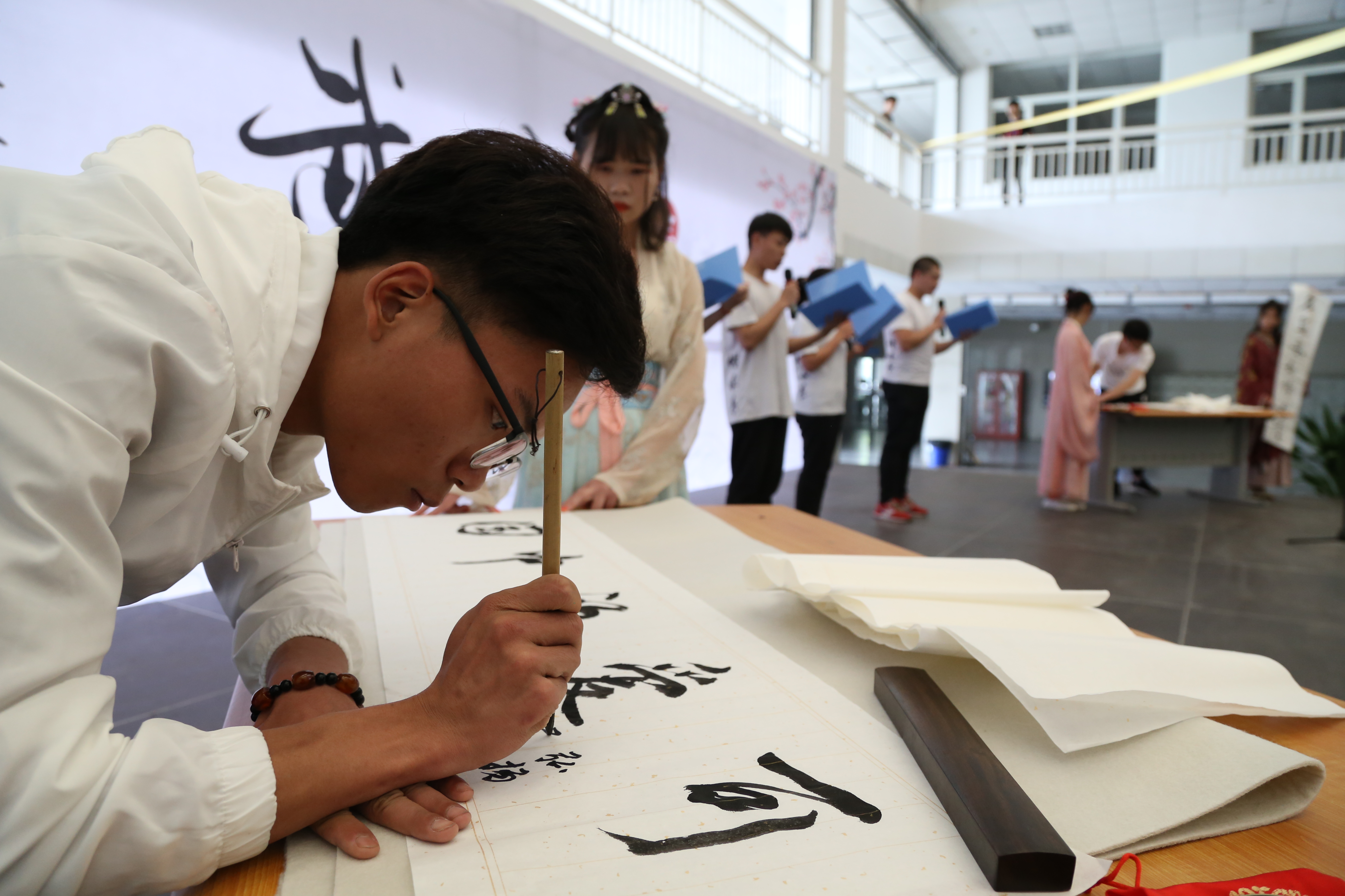 “朋友!中国是生育我们的母亲。你们觉得这位母亲可爱吗?我想你们是和我一样的见解,都觉得这位母亲是蛮可爱蛮可爱的……”在当天开幕式的舞台上,在学院传媒影视系浮生绘工作室慷慨激昂的《可爱的中国》的朗诵中,风雅国学社和墨轩书法协会的几名同学潇洒挥毫,自信地书写下“可爱的中国”五个大字。古风颂雅,笔墨生香。经典爱国诗文加上传统的书法,再现武信学子追根溯源的初心。