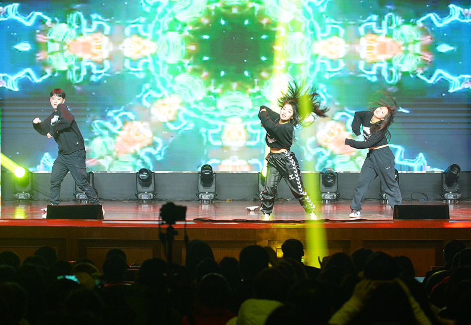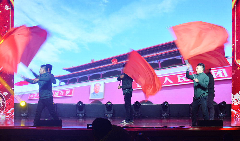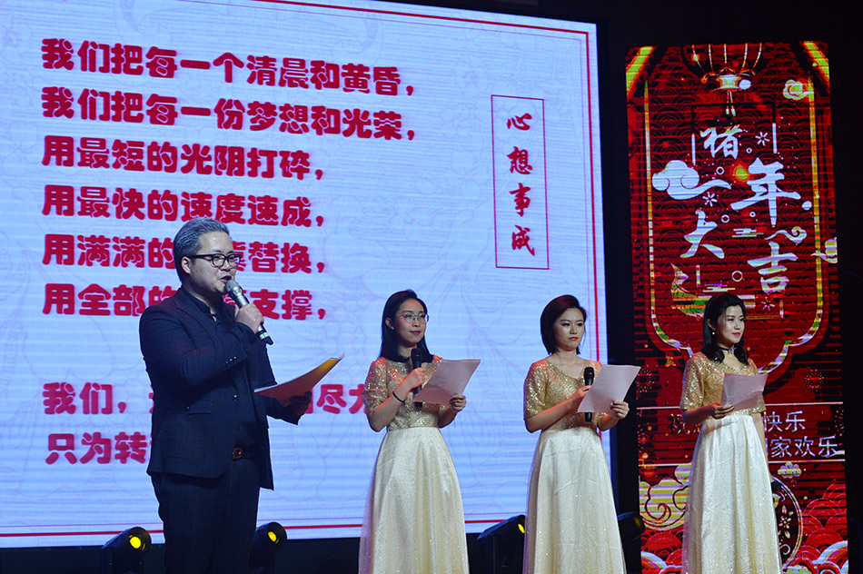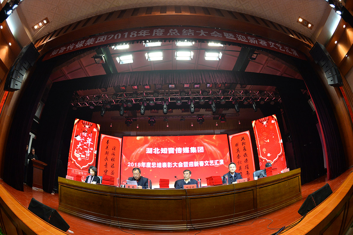 “知音传媒集团2018年度总结大会暨迎新春文艺汇演”的主题大字,璀璨夺目。