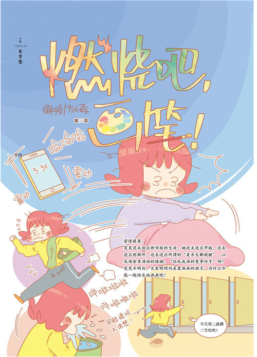 绘本连载作品《燃烧吧,画笔!》则立足真实的艺考,用青少年喜闻乐见的绘本漫画表达,记录一群高三美术考生真实美好的画画时光,展现了当代中国素质教育的蓬勃发展,新时代青年的青春梦想和青年们的激扬青春成长史。新时代下,青年们向着梦想勇往直前的精气神,如此动人,如此美丽!作品赋予青少年美的艺术感受,耳濡目染的审美熏陶和丰富的心灵给养。新时代青年的梦想,在一张张画纸上熠熠生辉。
