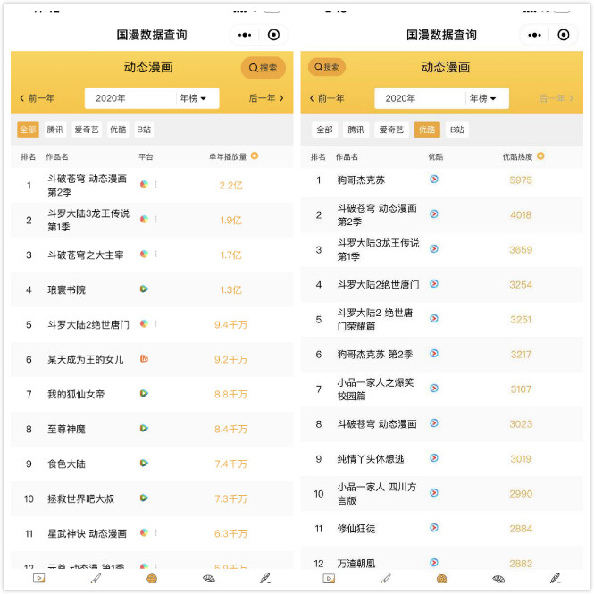 从2015年动态漫画进入主流视野,到今年《斗破苍穹·动态漫画》引领动态漫画逐步成为主流,动态漫画在争议中不断成长,影响力也在稳步提升。如果仔细观察爱奇艺、腾讯视频、优酷、B站等主流视频平台的动画节目榜单,会发现有不少动态漫画都排名靠前,热度远远超过一般动画。像《斗破苍穹》《斗罗大陆3龙王传说》这样根据国民级IP改编的动态漫画,有时候甚至能在平台动画榜单中进入前5。