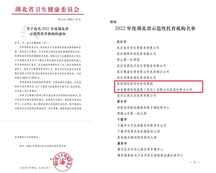 日前,湖北省卫健委印发《关于命名2022年度湖北省示范性托育机构的通知》,武昌区知音托育园、东西湖区径河知音托育园获评“湖北省示范性托育机构”。这是湖北省首批省级示范性托育机构,武汉市仅9所,其中知音托育两园所成功获评。省卫健委要求各级卫健部门总结示范机构的经验做法,以点带面,最大限度发挥示范机构示范作用。